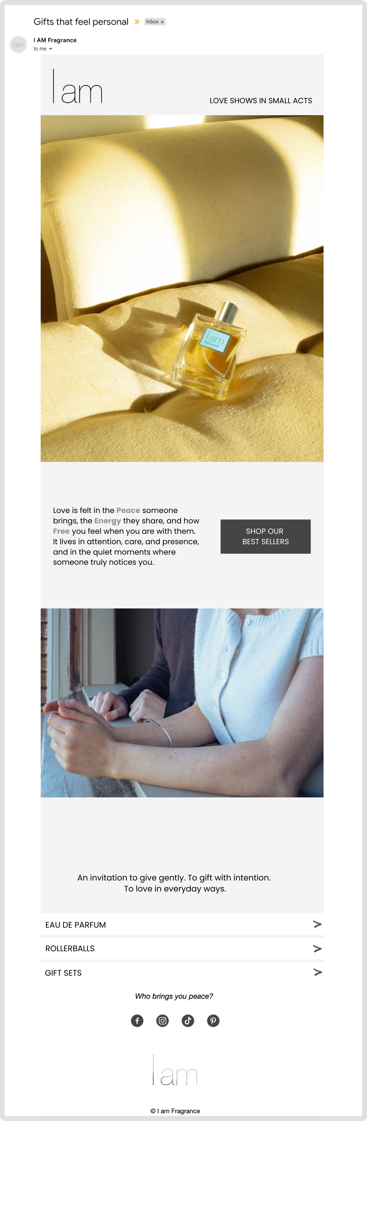 I AM Fragrance is a Los Angeles-based fragrance brand rooted in ritual, intention, and the belief that scent is a daily practice. As Marketing & Brand Lead, I oversee every aspect of how the brand shows up in the world, from the website and email campaigns to content strategy, photography, and day-to-day operations.
